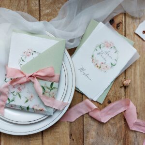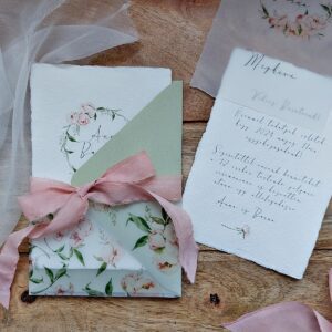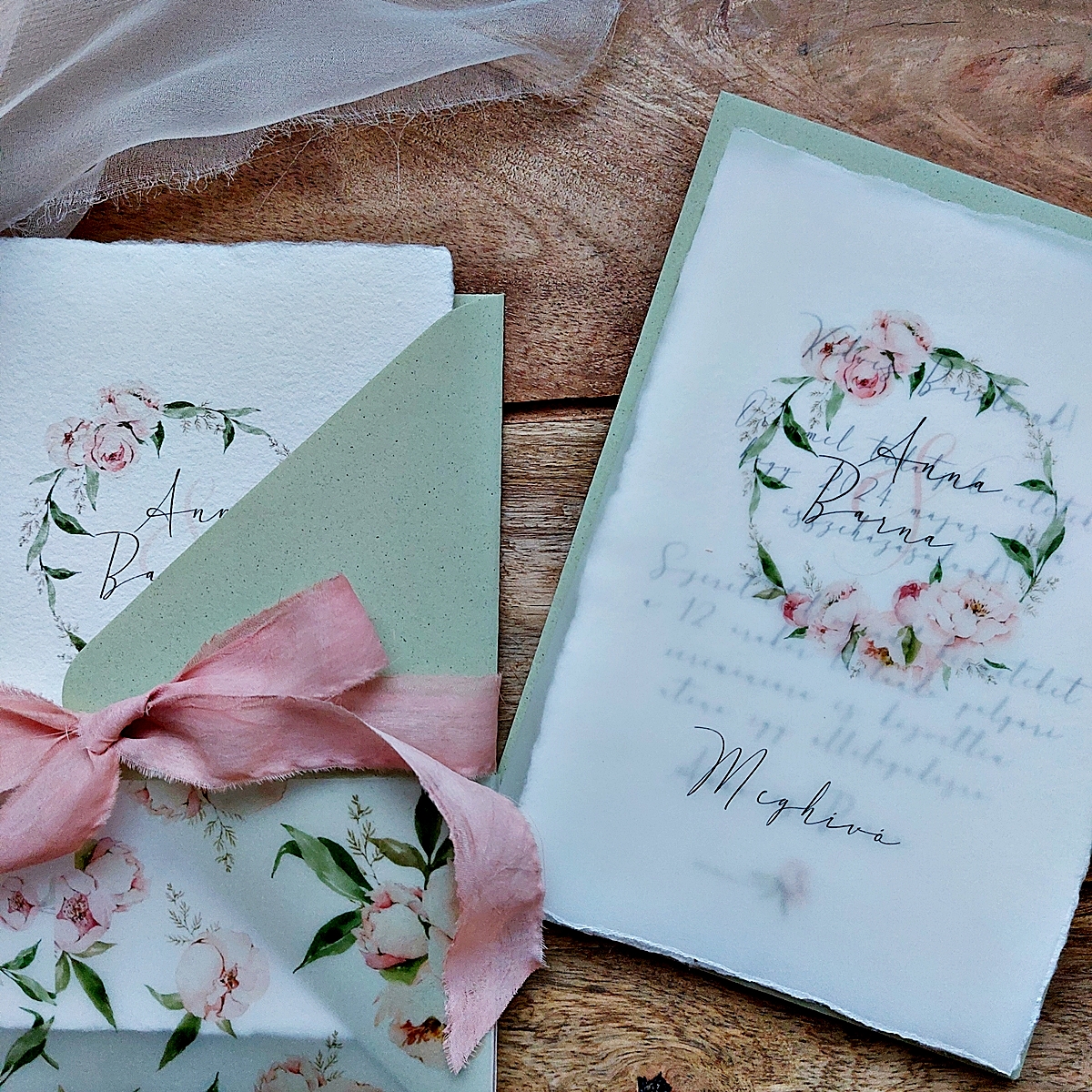 1 db A6-os méretű merített papír alapú 1 oldalas meghívó, amely a kalligrafikus szöveget tartalmazza (148 mm x 105 mm)
