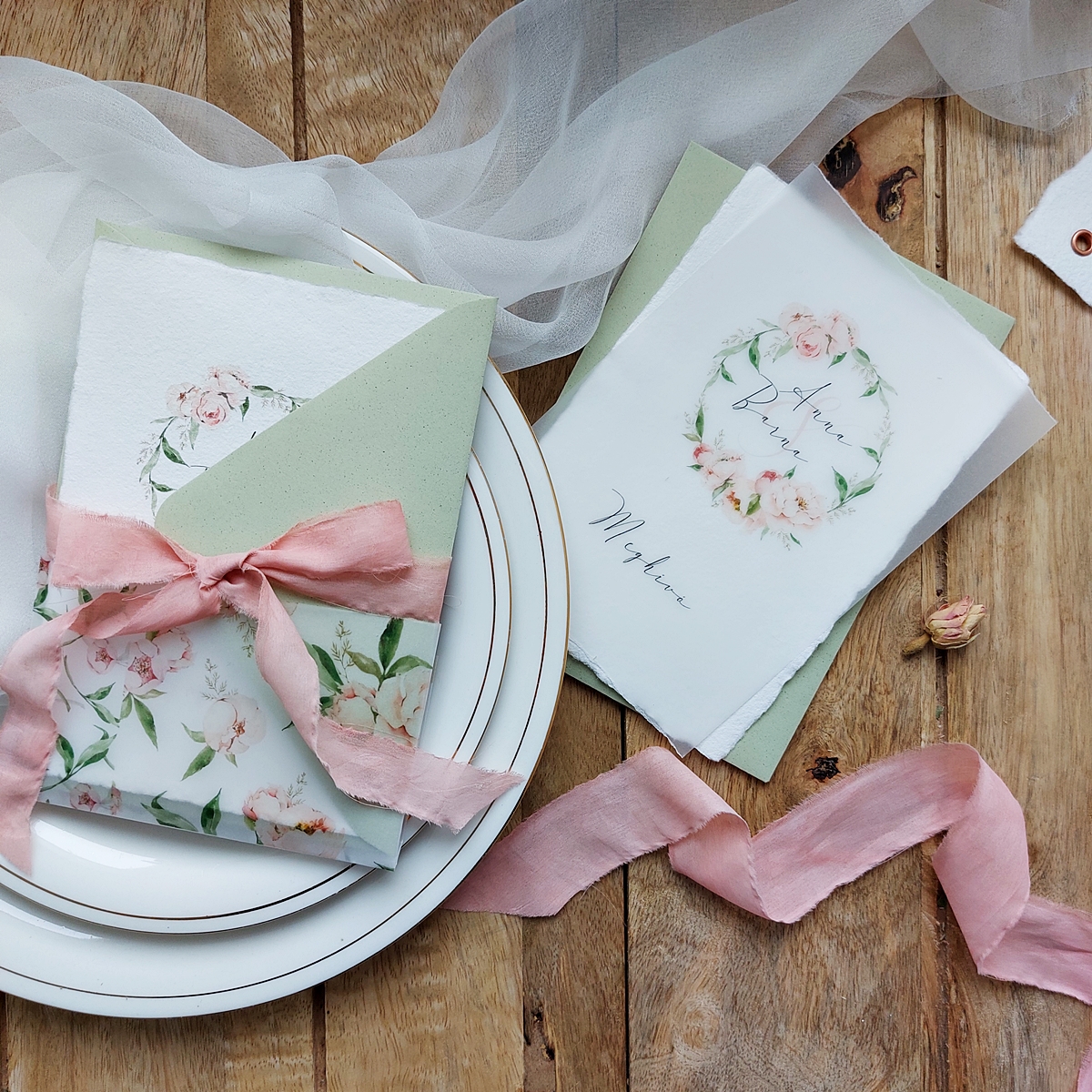 A merített papír újra reneszánszát éli, igazán exkluzív, mégis végtelenül romantikus hangulatot áraszt, amit picit megfűszereztünk egy leheletnyi áttetszőséget adó selymes pauszborítással. E kettő édes harmóniája adja e meghívó különleges báját.